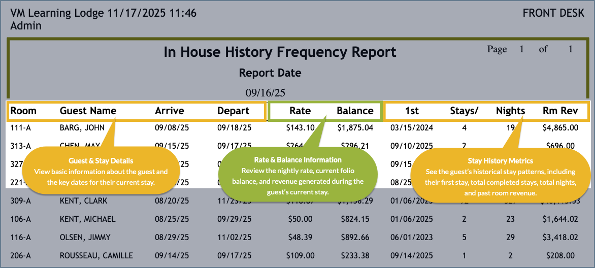 This section helps you read the report more confidently by explaining the guest details, historical stay metrics, and visit patterns included for every in-house guest.