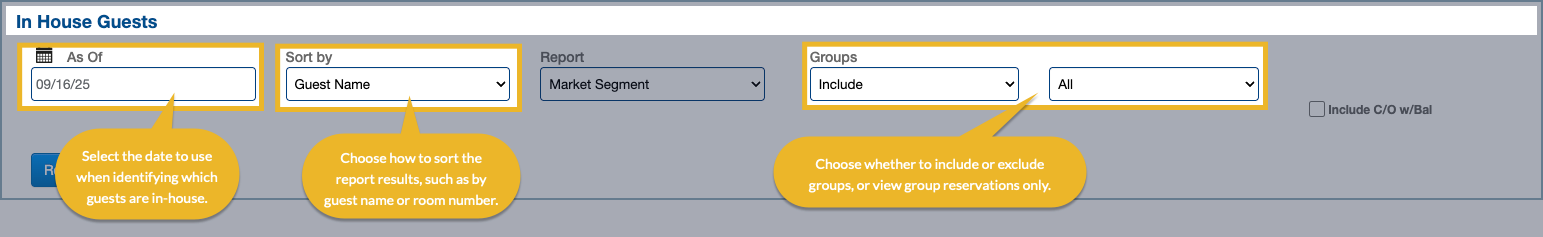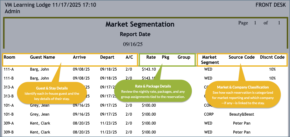 Use this section to understand how the Market Segmentation report organizes in-house reservations and displays stay, rate, and segmentation details for each guest.