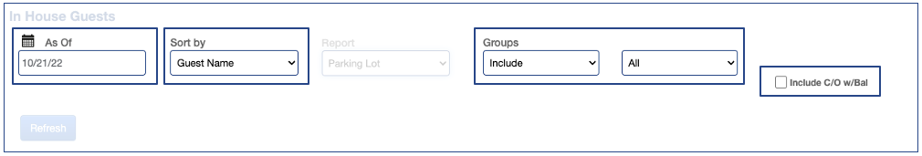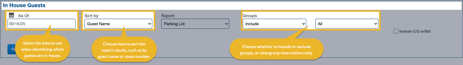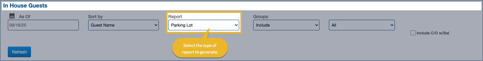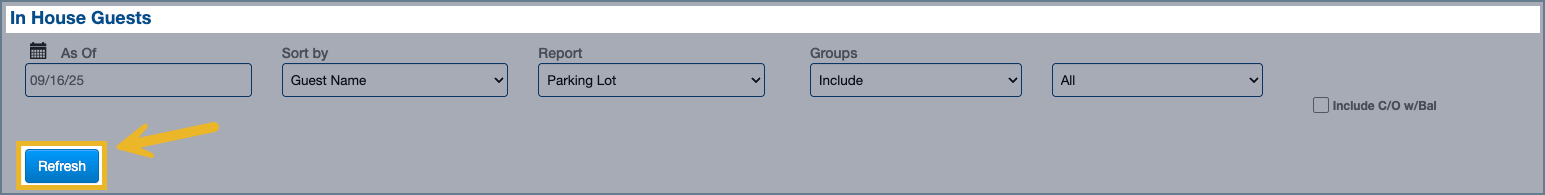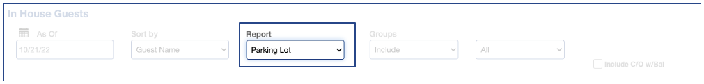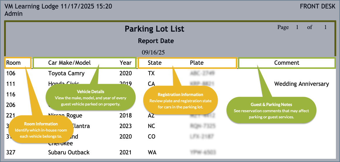 - Use this report at shift-change to hand off to valet or parking team the full list of guest vehicles for the current day.