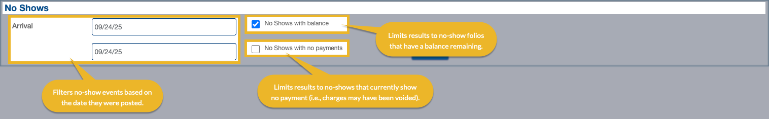 - Choose whether to show only no-shows that have a balance pending.