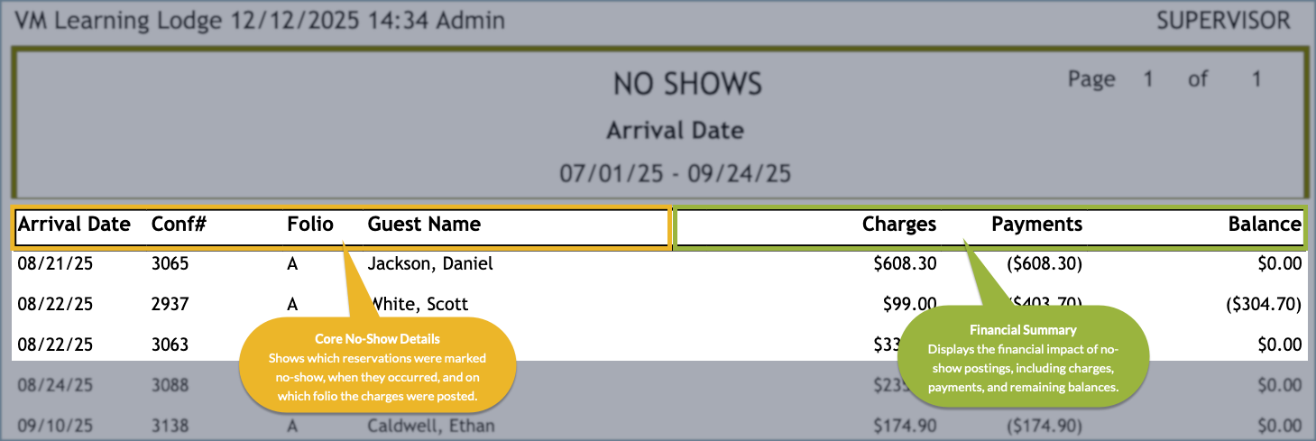 The No Shows Report lists each reservation flagged as a no-show through the automatic posting process, along with pertinent folio details so you can review charges, payments, and balances.