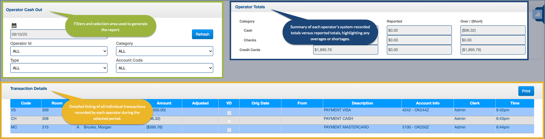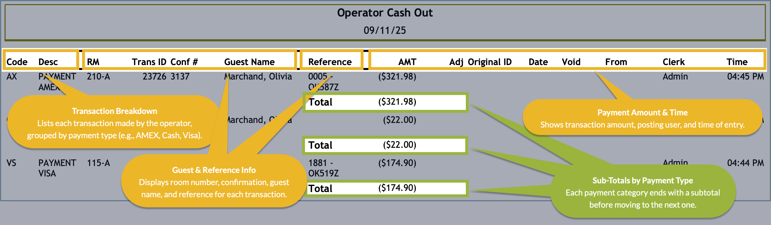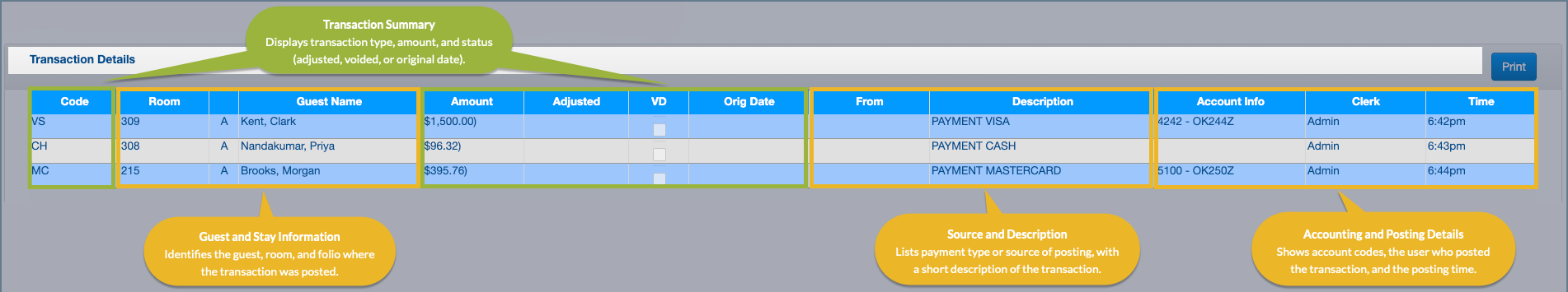 - Room / Folio / Guest Name – Identifies the guest and reservation associated with the transaction. The letter in the A column indicates the folio type.