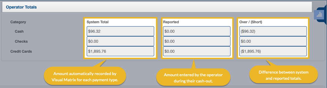 - Code: The transaction code or payment type (e.g., VS for Visa, MC for Mastercard, CH for Cash).