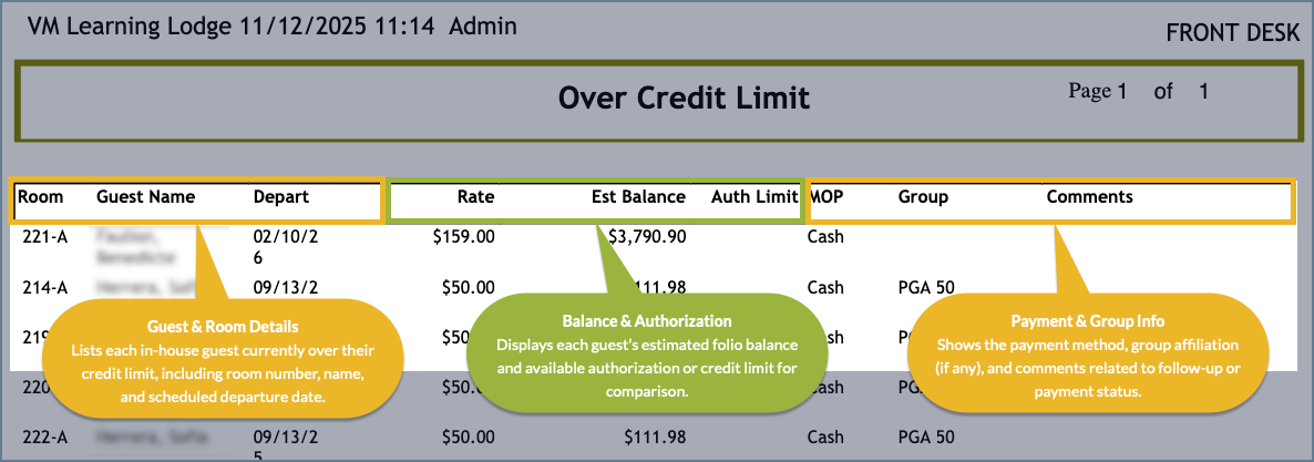 The Over Credit Limit Report lists in-house guests whose folio balances currently exceed their available credit, including any payments or credit card authorizations on file. Reviewing this report helps staff identify guests who may need additional deposits or pre-authorizations before check-out.