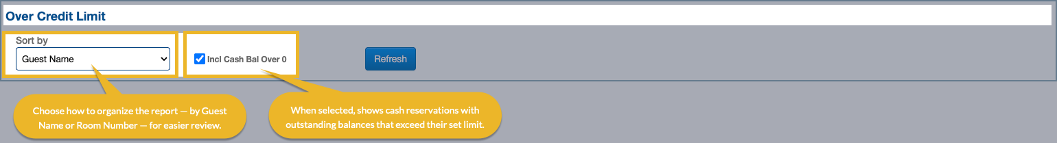 - Include Cash Balances Over 0: When selected, the report also includes cash reservations with outstanding positive balances. This helps identify any cash-paying guests who may need additional deposits to stay within policy.