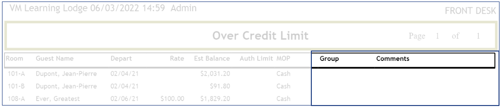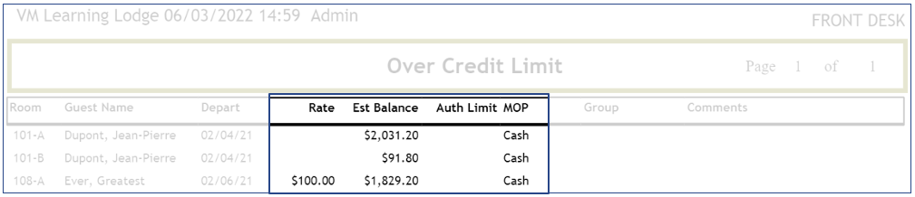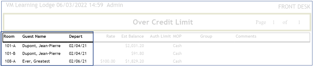 The Over Credit Limit report showcases reservations lacking sufficient credit to cover their stay balance, whether due to payment or credit card authorization.