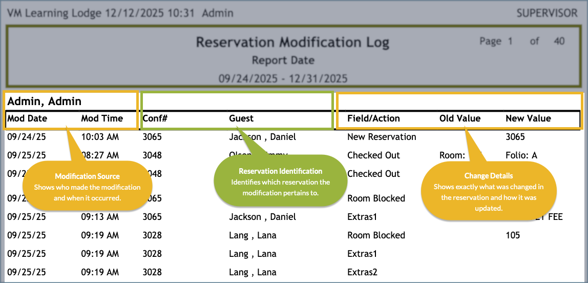 - Field/Information Modified: The specific reservation field that was changed (e.g., arrival date, rate).