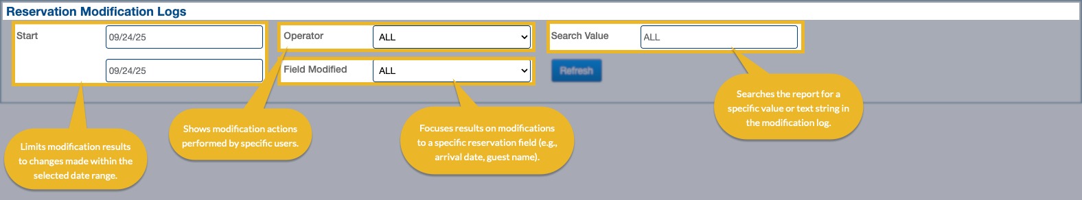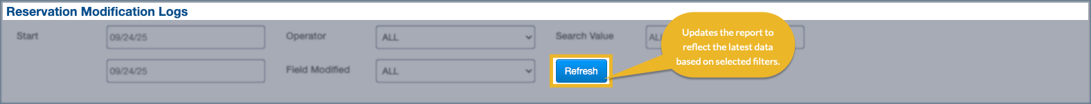 1. This report is generated by applying filters that narrow the scope of reservation modifications you want to review. Use the filters along the top of the report to refine your results: