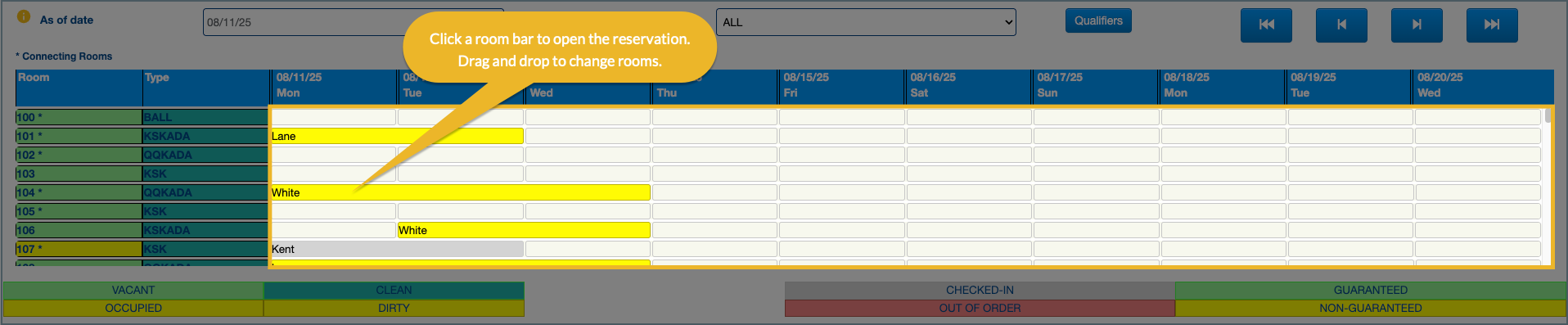 5. Click a room bar (white, gray, green, or yellow) to open the reservation. To change rooms, drag and drop the guestâwhether guaranteed or non-guaranteedâto a new room.