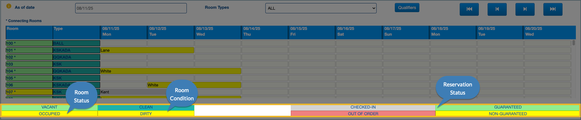 6. Refer to the Room Chart Legend for color-coded status definitions (e.g., out-of-order, available, reserved).