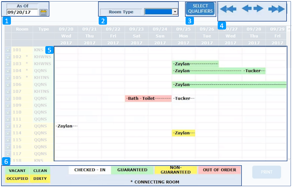 4. Use the left or right single-arrows to scroll through days on the room chart or use the left or right double-arrows to scroll through weeks on the room chart.