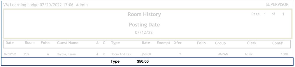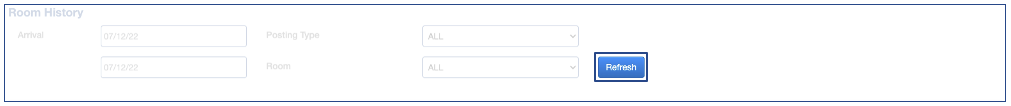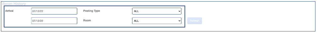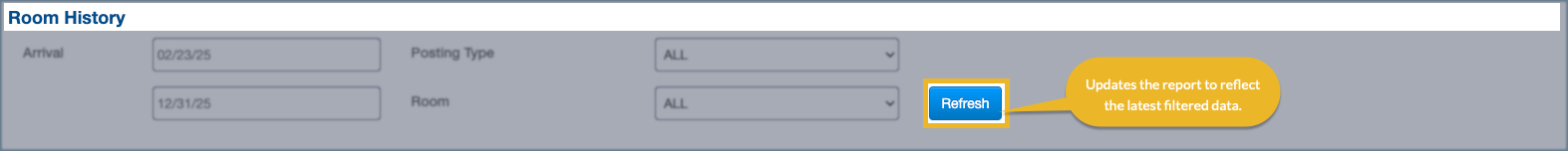 The Room History Report organizes room posting details into clearly defined columns so you can review transactional activity — including charges, check-out adjustments, no-shows, and extras — at both the room and account level.