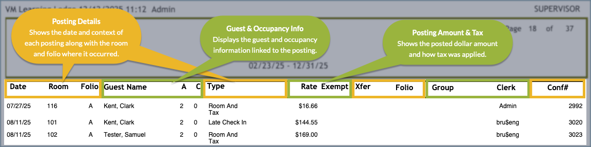 - Posting Type: Category of posting (Room & Tax, Extra, No-Show, Early Check-Out, etc.).
