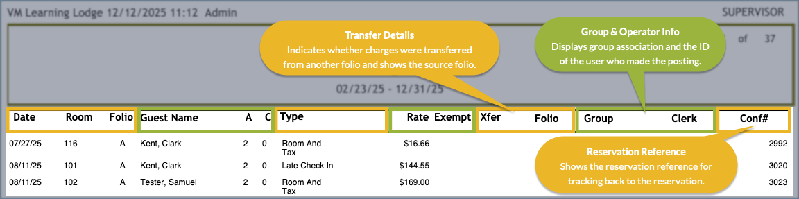- Transfer Indicator: “Y” if the charge came from another folio.