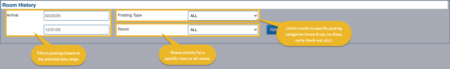 This report uses filters to narrow activity by date range, posting type, and specific rooms. Use the filters along the top of the report to refine your results:
