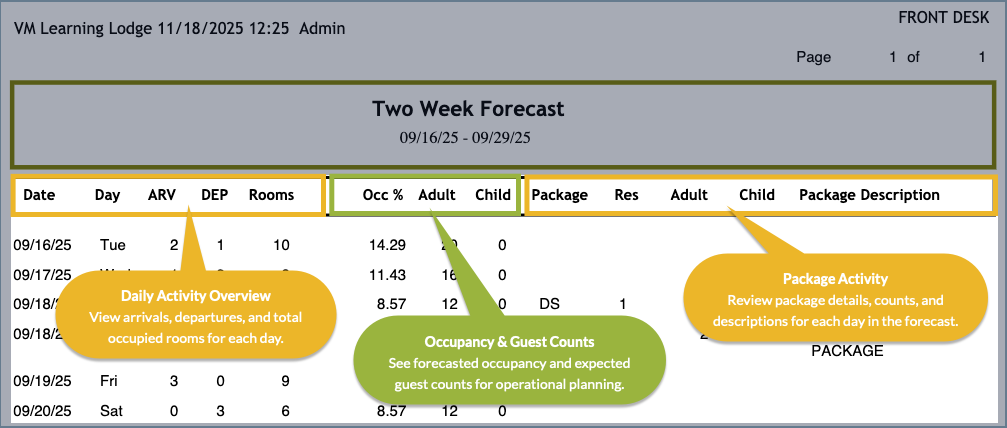 Operational planning depends on knowing who is arriving, who is departing, and how many rooms and guests you can expect in the coming days. The Two Week Forecast Report gives your team a clear, day-by-day view of arrivals, departures, occupancy, and package activity for the next 14 days. This helps front desk, housekeeping, and management prepare staffing, scheduling, packages, and inventory for the weeks ahead.