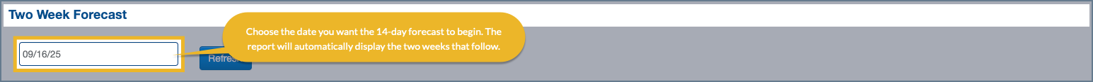 1. Select the Date. Choose the starting date for the forecast. The report will automatically display the next 14 days based on your selection.