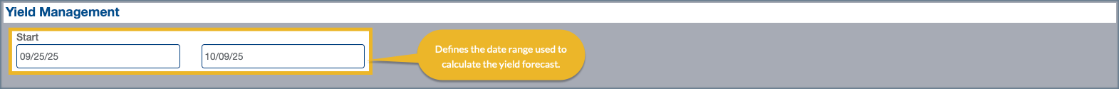 The Yield Management Forecast Report always runs for a two-week period. When you change either the Start or End date, the system automatically adjusts the other date to maintain a two-week range.