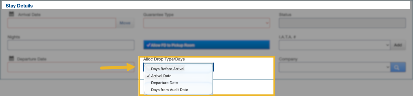 The allocation drop type and associated drop date/days settings control when non-picked allocations (rooms reserved for the group but not converted to reservations) are released back into general inventory. Understanding these settings helps ensure your block behaves as intended, avoids leaving rooms unnecessarily blocked, and maximizes revenue opportunities. In the following sections, we’ll explain the four drop-type options, how they work, and when to use each (You can edit these fields under Front Office → Group → Stay Details when setting or modifying a group).