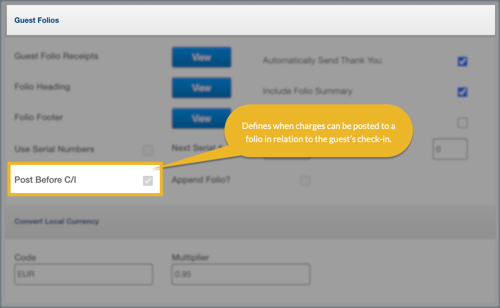 - Post Before C/I*: Allows charges to be posted to the folio before the guest has checked in.