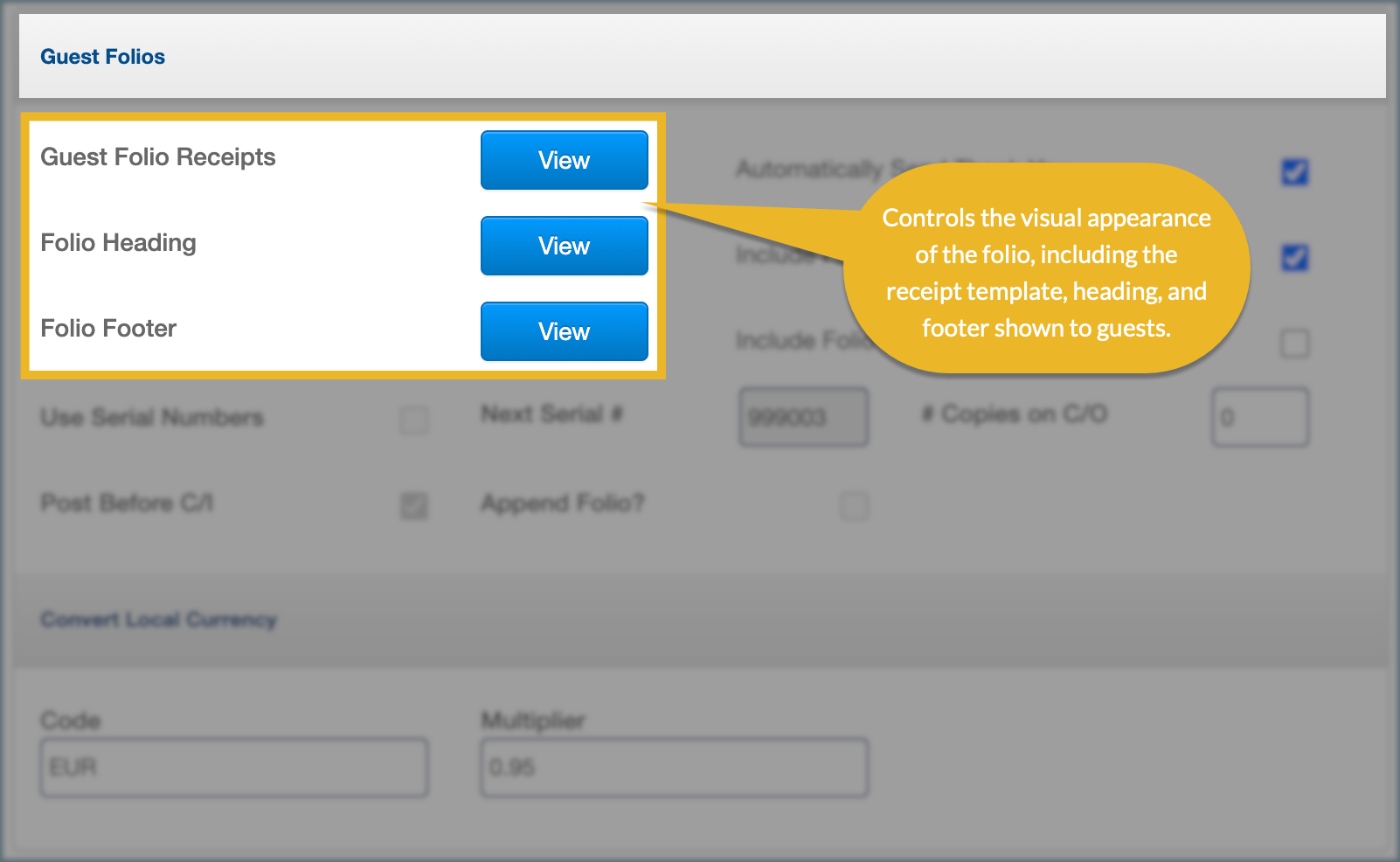 - Guest Folio Receipts: Opens the receipt template used for printed or emailed folios.