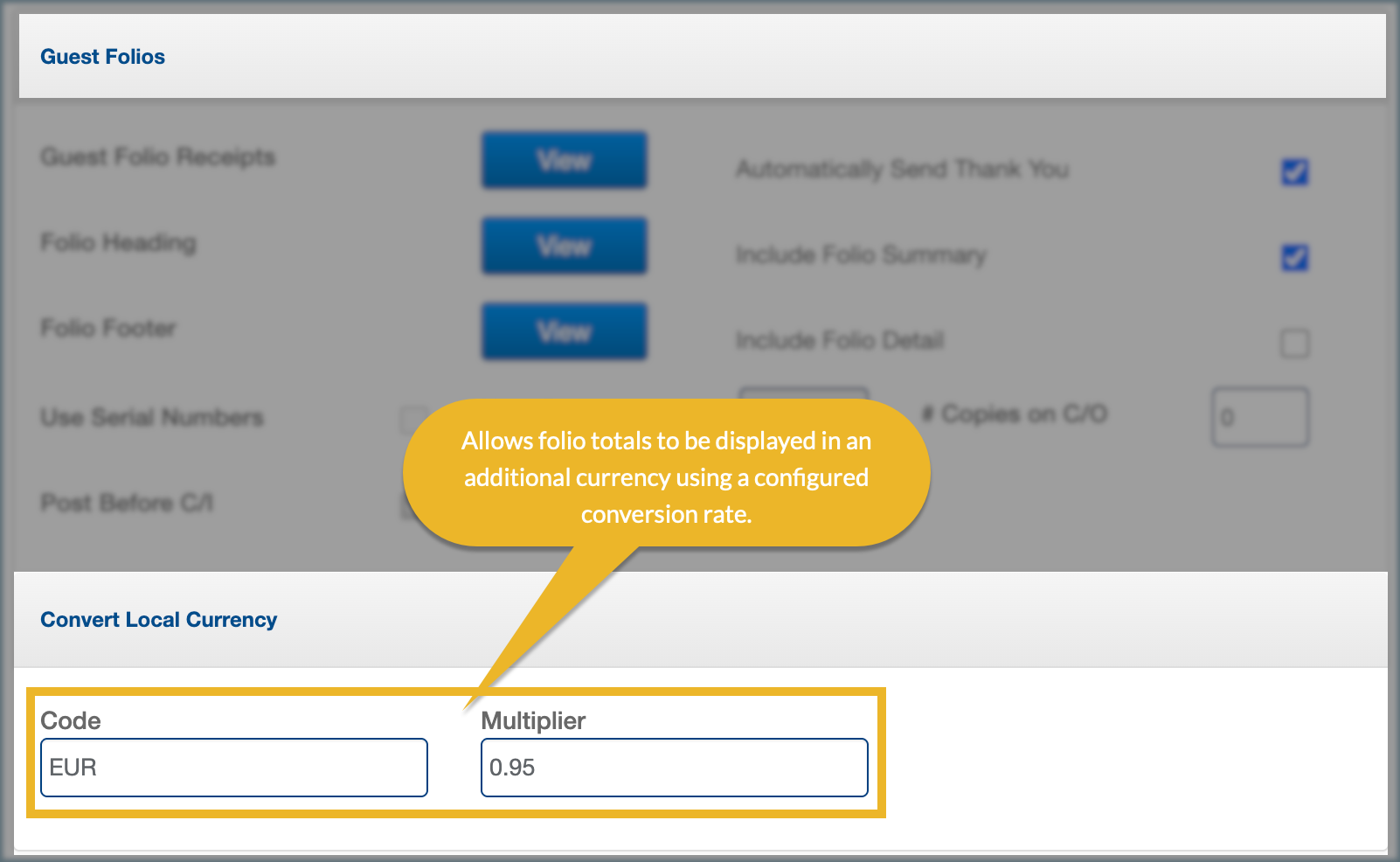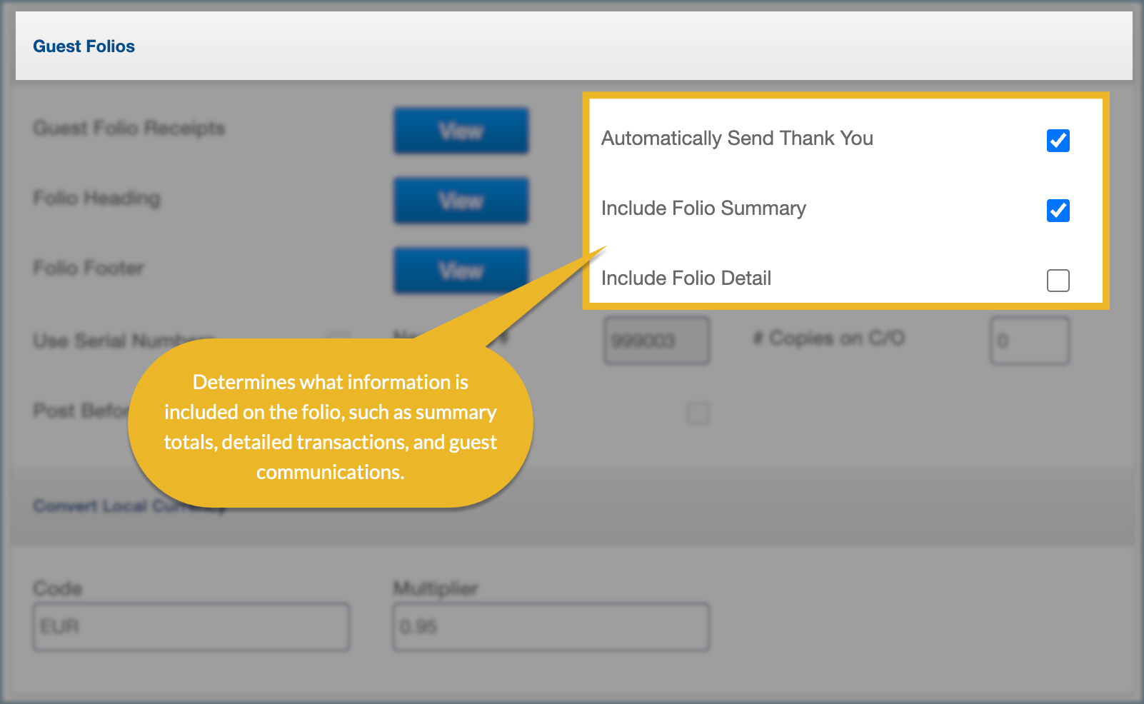 - Include Folio Summary: Adds a summarized view of charges to the folio.