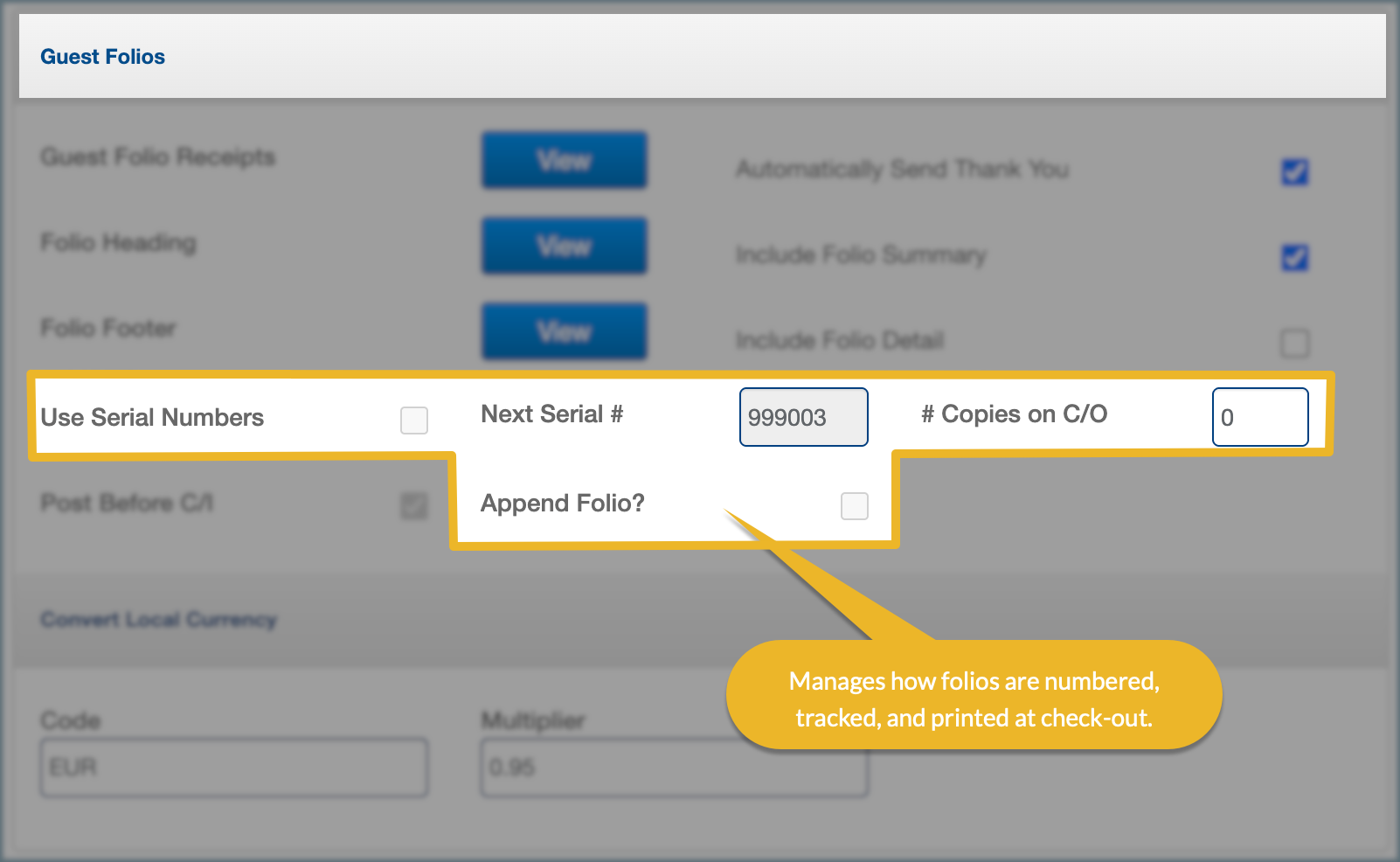 - Append Folio?*: Appends the reservation ID (folio number) to the serial number so the original folio reference is not hidden.