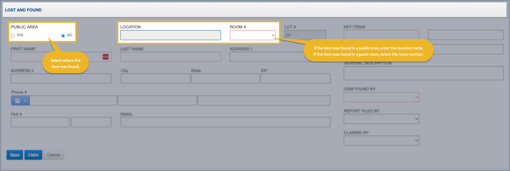 1. Select whether the item was found in a public area or a guest room.