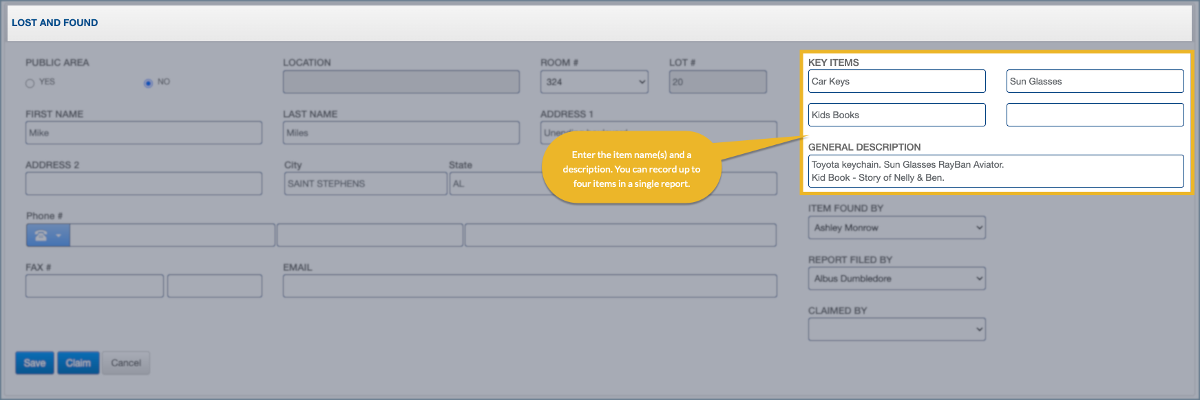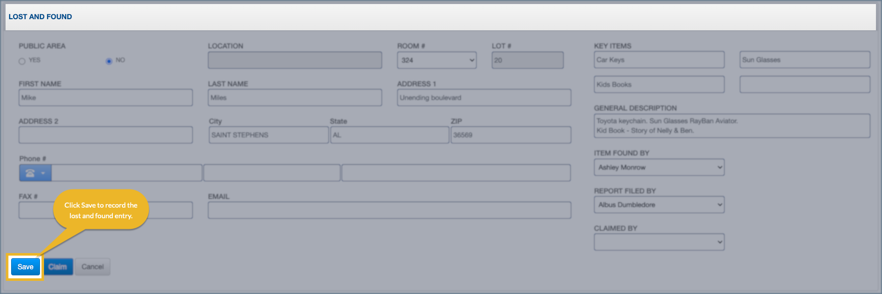 5. Click Save to record the lost and found entry.