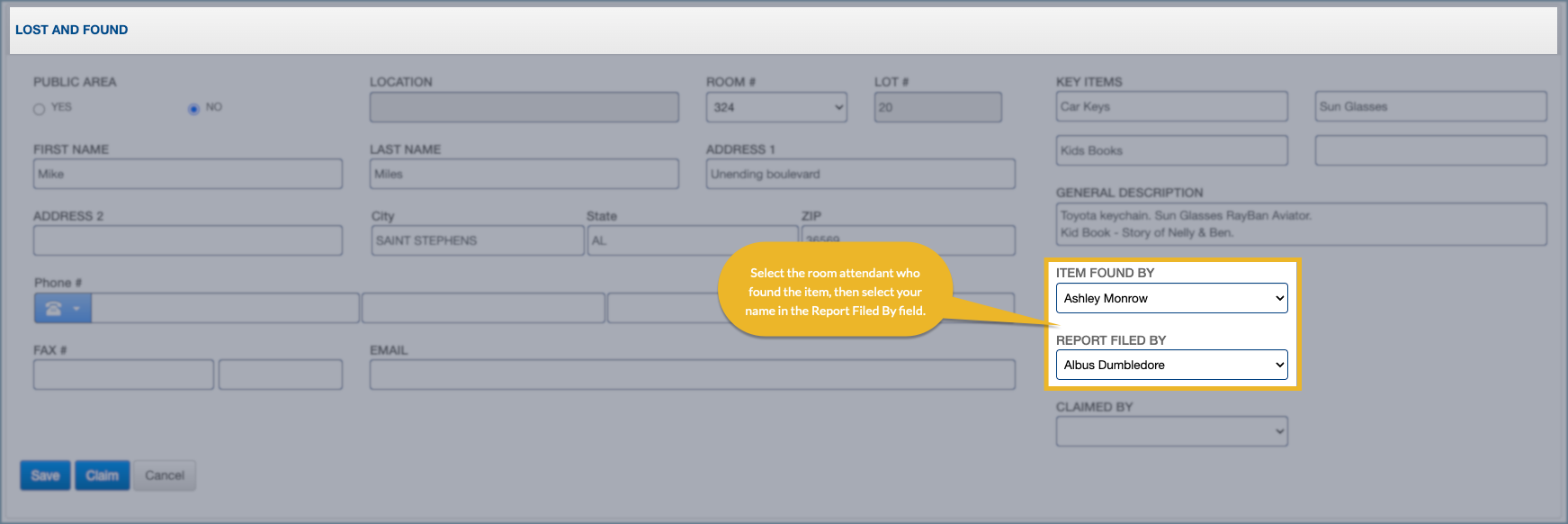 4. Select the room attendant who found the item, then select your name in the Report Filed By field.