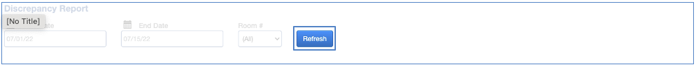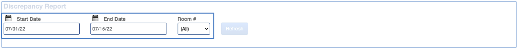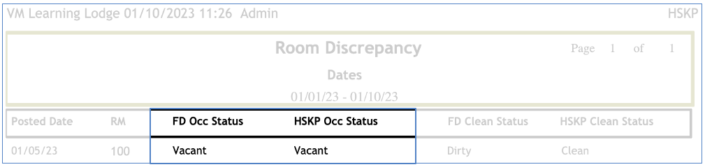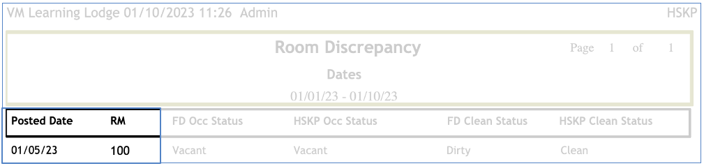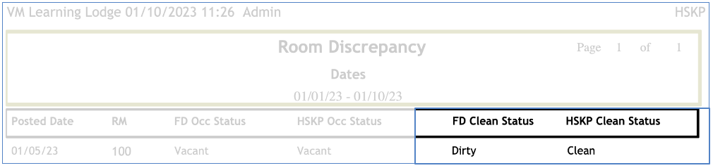 The Discrepancy Report helps identify room status variations between Front Office records and Housekeeping reports. To populate this report, Housekeeping must have previously entered discrepancy notifications in the system.
