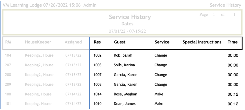 The Housekeeping Service History report provides a comprehensive overview of the rooms that were serviced, including details such as the room number, the date and staff member who performed the service, the type of service conducted (Make/Change), and the duration of time spent in the room.
