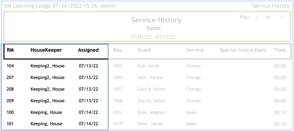The Housekeeping Service History report shows every room number that was serviced, when and by who, what type of service was done (Make/Change) and the time spent in the room.
