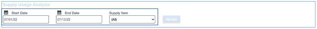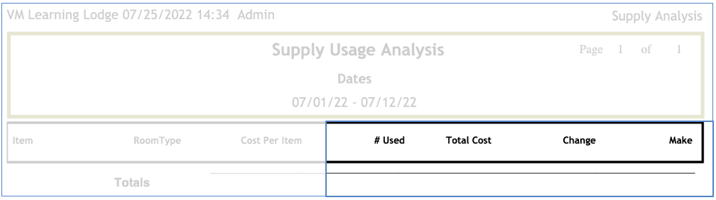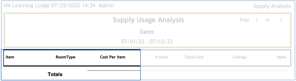 The Supply Usage Analysis Report enables you to assess the quantity and cost of items utilized or restocked by Housekeeping during room cleaning activities. This data is derived from the number of rooms sold and the configuration settings defined in the Supply Usage Setup. Path: Housekeeping > Reports > Supply Usage Analysis