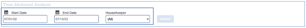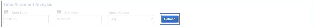 The Housekeeping Time Allotment Analysis report provides insights into the number of minutes each housekeeper has been assigned to work during the selected date range, depending on the service settings configured within the Time Allotment feature. For effective management of Cleaning Service Schedules, refer to the Setup Housekeeping Time Allotment section. Path: Housekeeping > Reports > Time Allotement Analysis