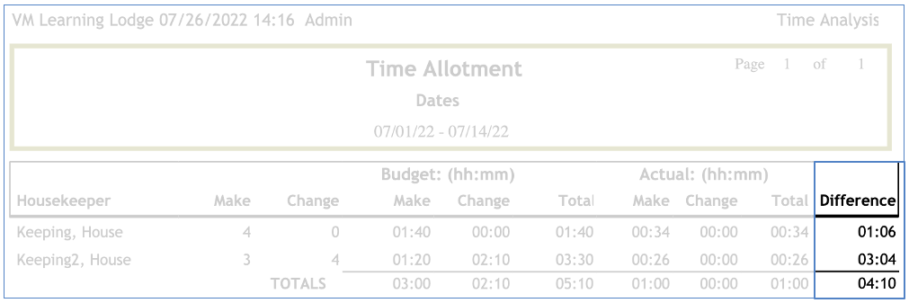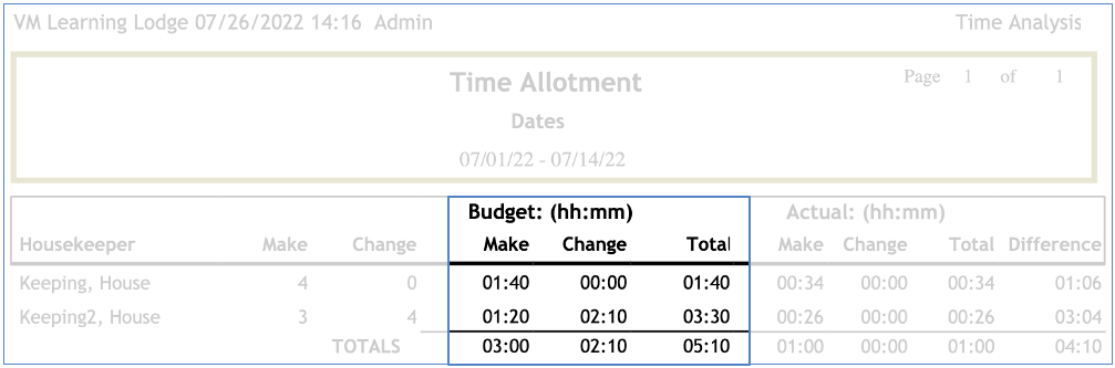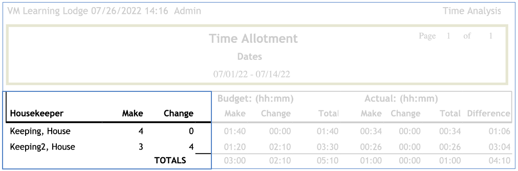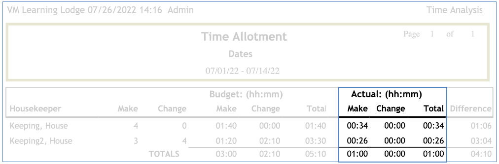 - Total Time the housekeeper spent on each type of service (Make/Change) for the period based on the data from the mobile app. If the mobile app is not used, the Actual data will be at "00:00".