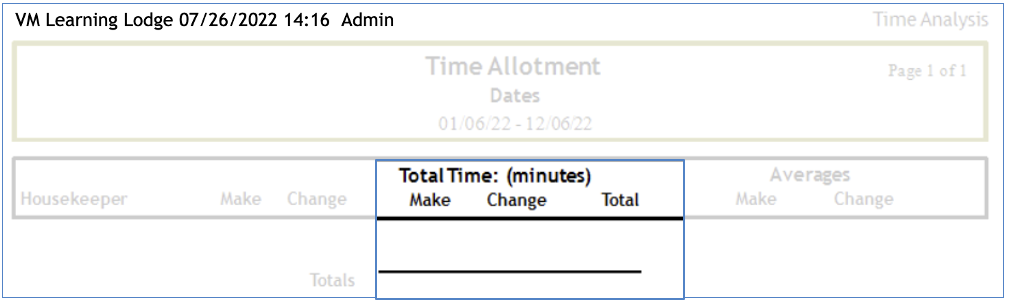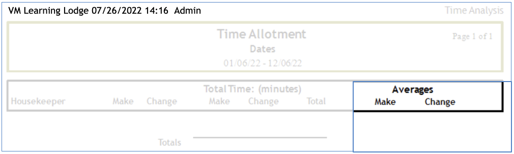 - Total time divided by the number of rooms assigned for the time period per type of service. Except if the setup was updated in the meantime, the averages should match the Time Allotment setup.