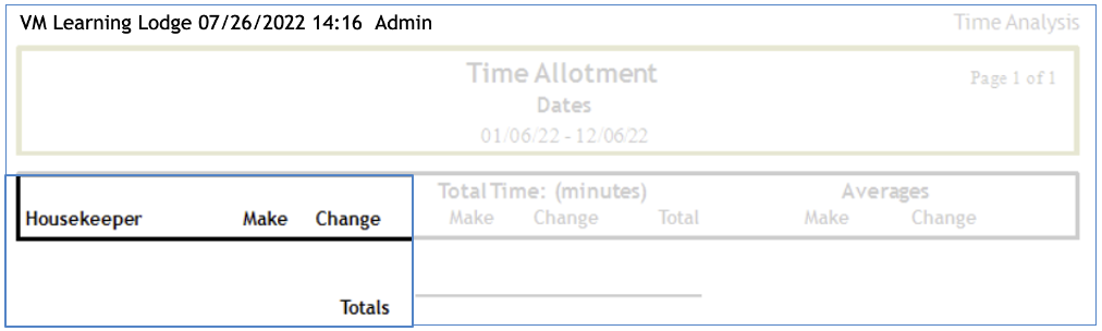 The Housekeeping Time Allotment Analysis report displays how many minutes each housekeeper has been assigned to work for the date range selected based on the service settings defined within Time Allotment.