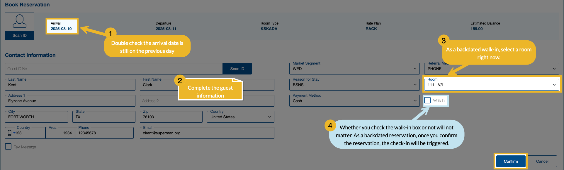 If you forget to backdate the arrival, the reservation will save with today’s date and cannot be corrected afterward.