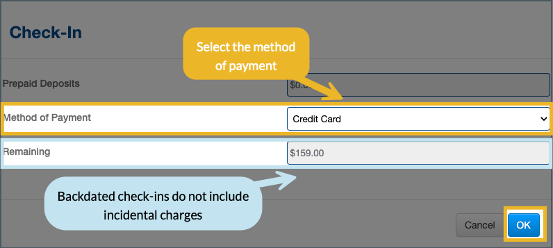 Any incidental amounts set up in the system will not be added in this case. Incidental charges are only included in the initial authorization if the check-in occurs on the same day as the arrival. Because this process backdates the arrival date, those incidental amounts will not be applied.