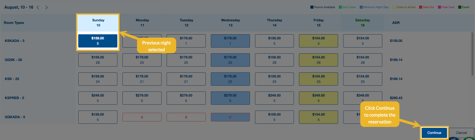 2. Select a Room Type on the Backdated Date: Once the calendar is backdated, it will display starting from yesterday’s date. Make sure you select the room type for that date to ensure the reservation is tied correctly to the intended arrival.