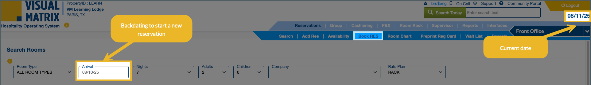 1. Backdate the Arrival Date: This is the most important step—set the arrival date to yesterday’s date. If you are working from the Availability or Room Chart screens, use the arrow controls to move back to the previous date.