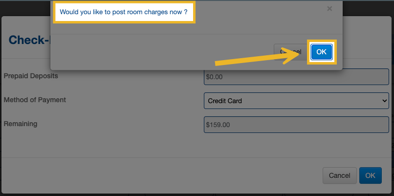 6. Confirm Room Charges: After entering the method of payment, a prompt will appear: “Would you like to post room charges now?” Click OK to continue.