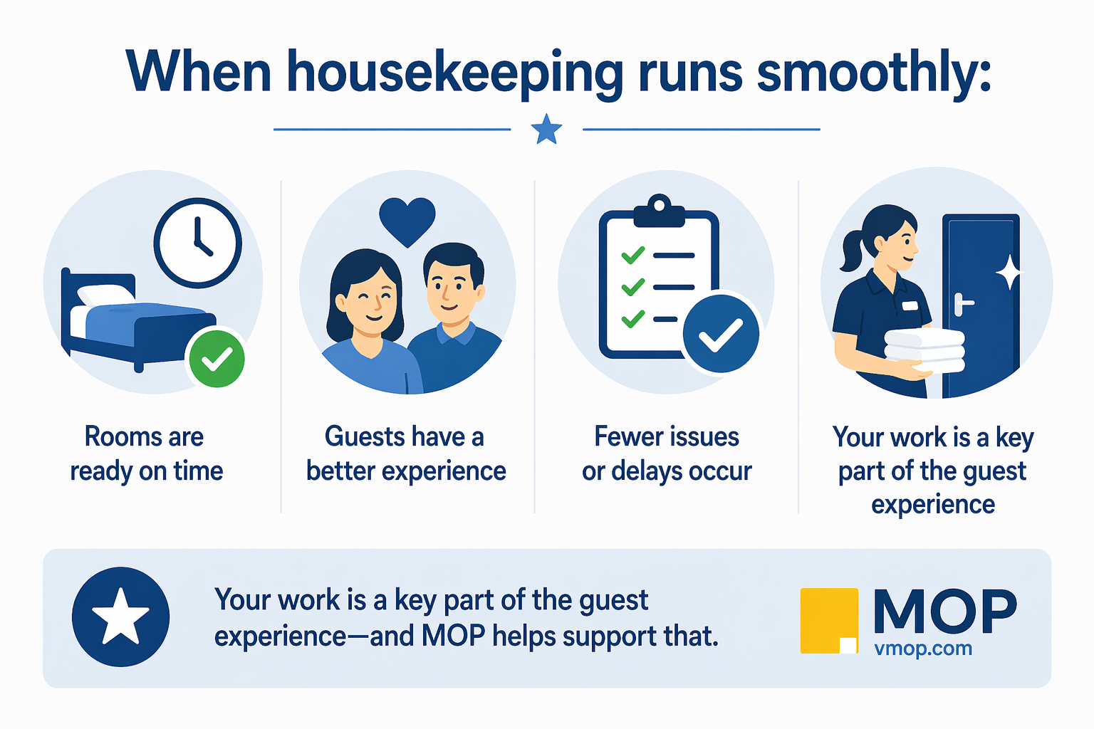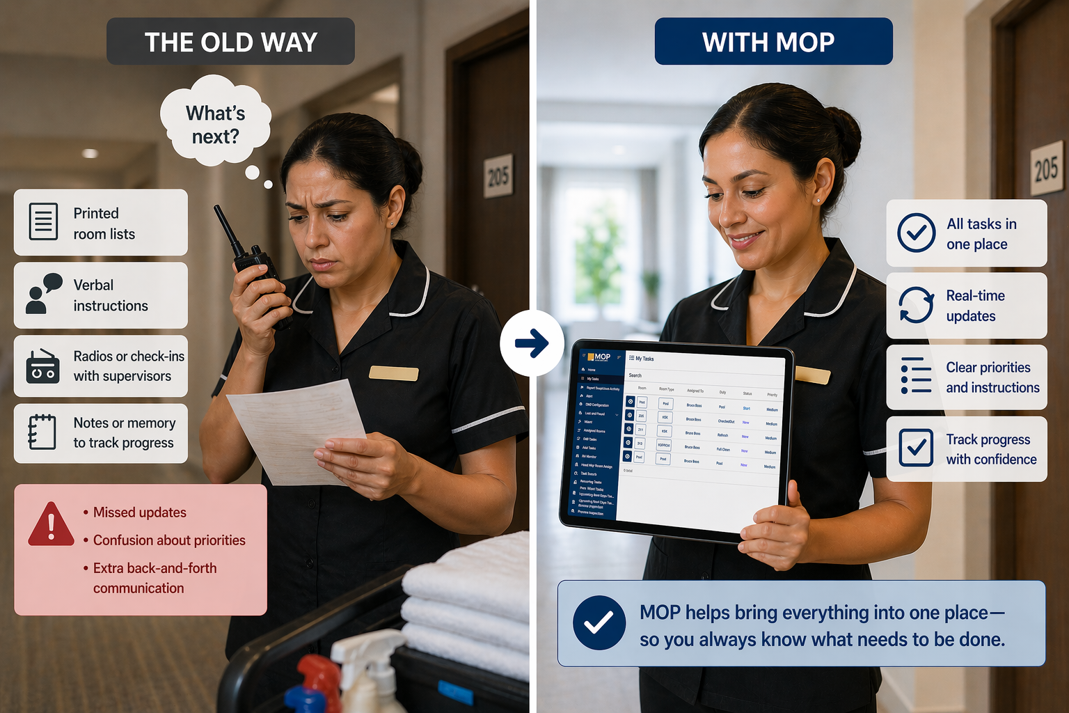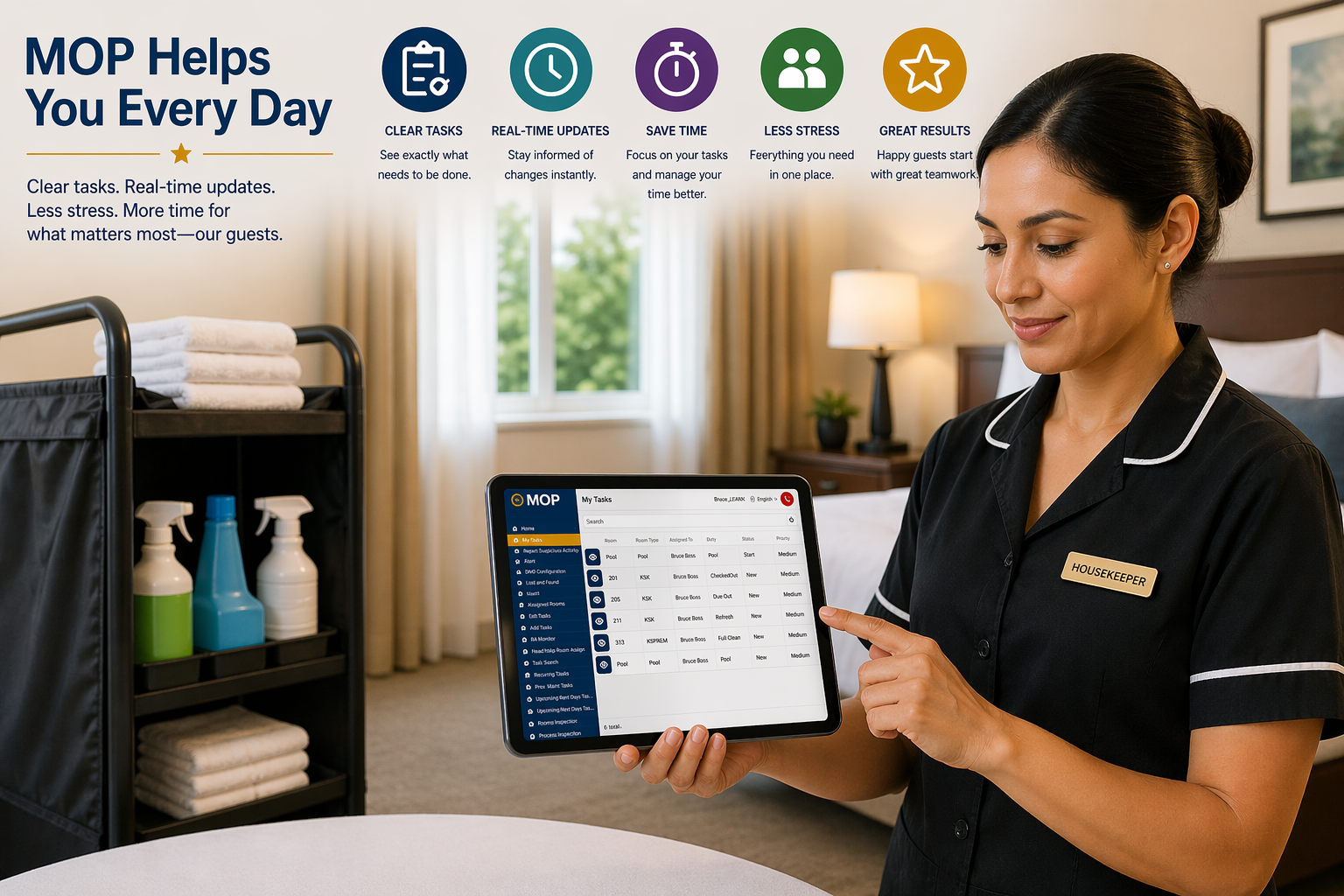 Housekeeping is one of the most important roles in hotel operations. Room readiness, cleanliness, and attention to detail directly impact the guest experience. MOP is designed to support housekeepers by making daily tasks clearer, more organized, and easier to manage—so you can focus on your work without unnecessary confusion or delays. This article explains how MOP helps housekeepers stay organized, manage tasks efficiently, and complete their work with confidence throughout the day.