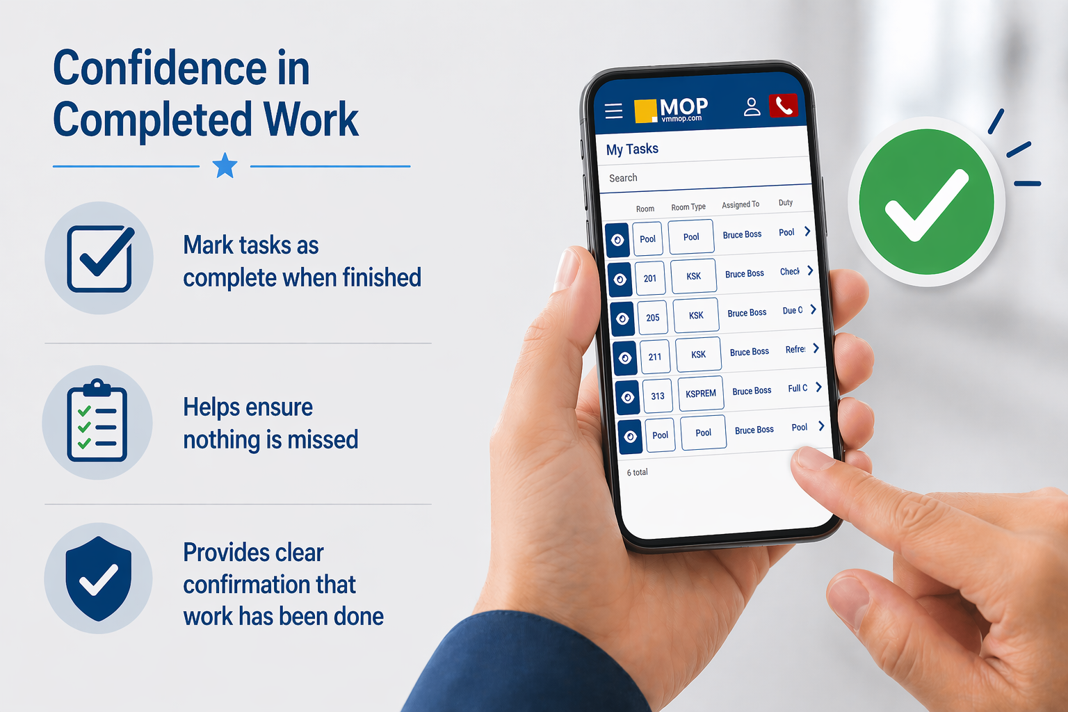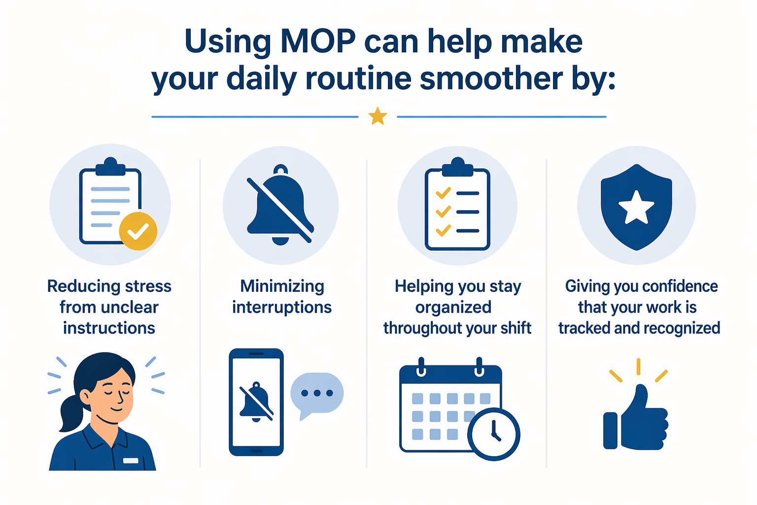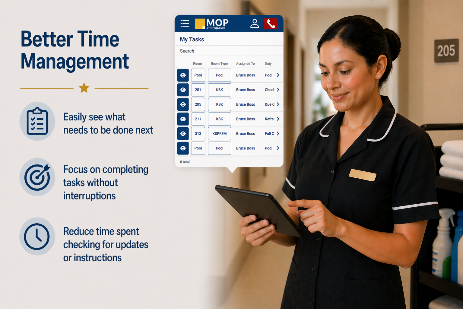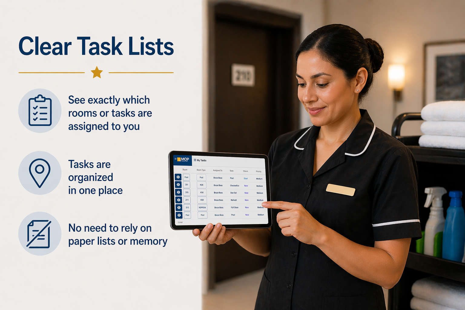 Housekeeping is one of the most important roles in hotel operations. Room readiness, cleanliness, and attention to detail directly impact the guest experience. MOP is designed to support housekeepers by making daily tasks clearer, more organized, and easier to manage—so you can focus on your work without unnecessary confusion or delays. This article explains how MOP helps housekeepers stay organized, manage tasks efficiently, and complete their work with confidence throughout the day.
