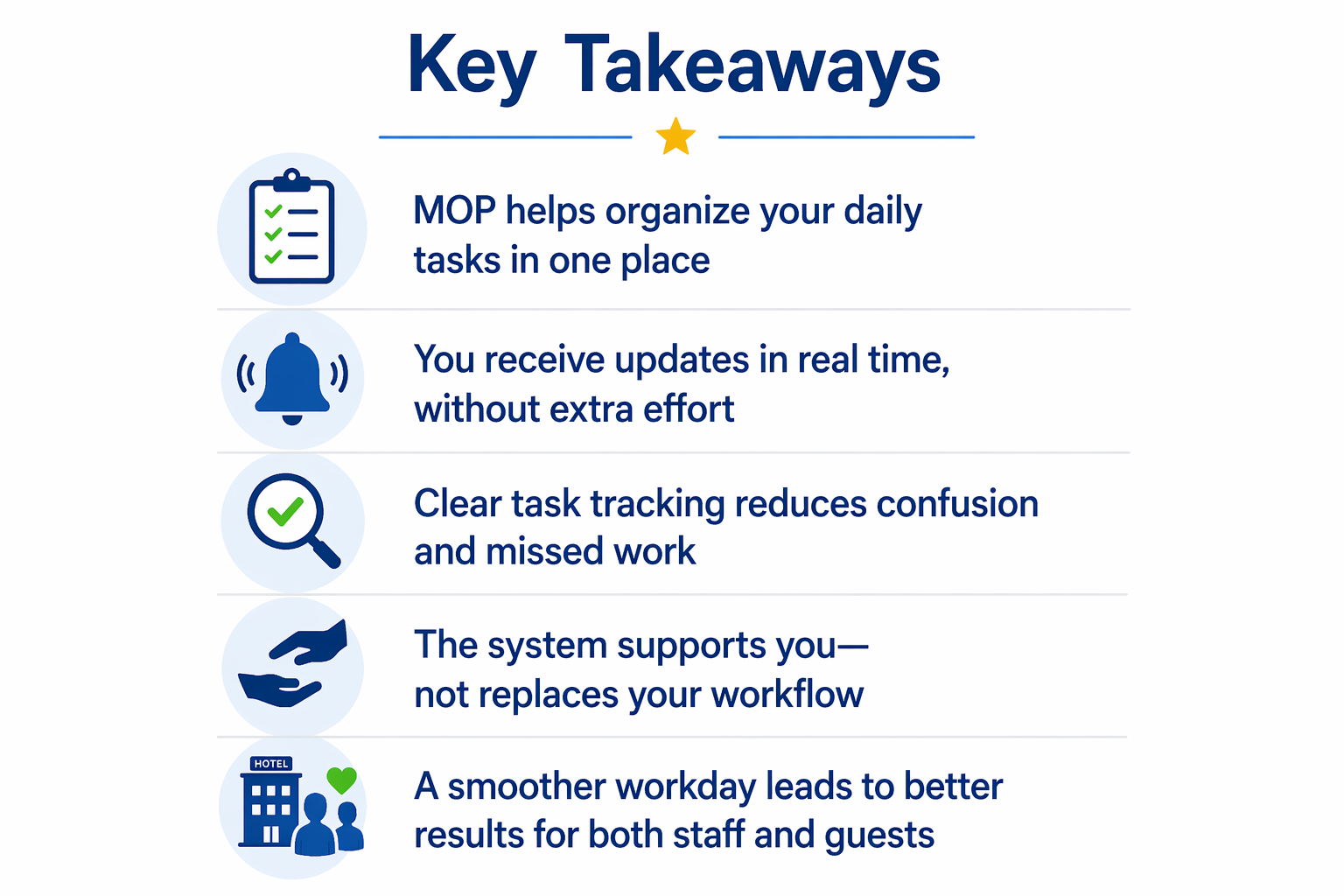 These key takeaways highlight how MOP simplifies your day, keeps you informed, and helps you work with greater confidence and efficiency.