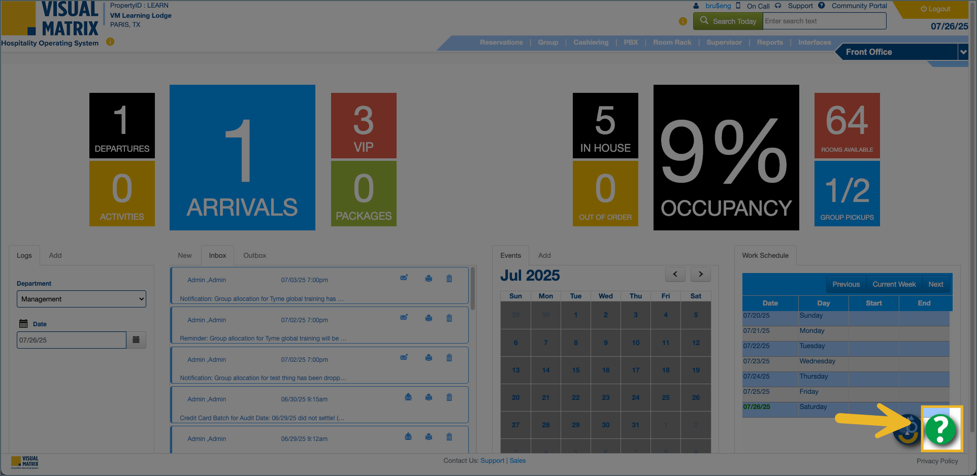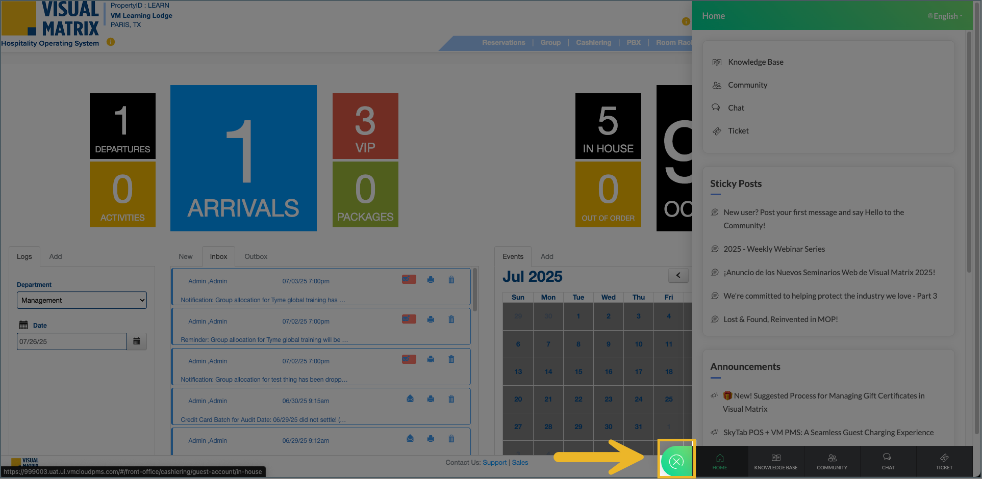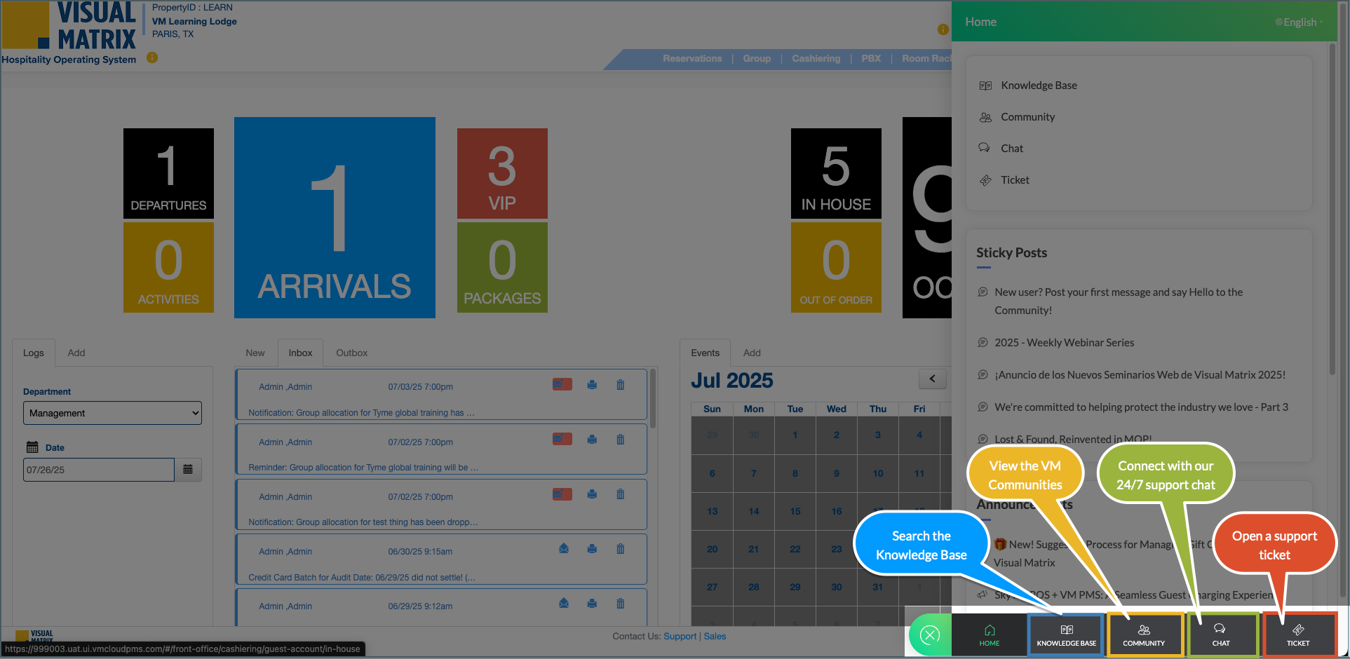Your Visual Matrix Cloud PMS includes quick, in-app access to our full Knowledge Base—so you can find help, articles, or open tickets without leaving the system. This handy feature keeps support just one click away, right where you’re working.