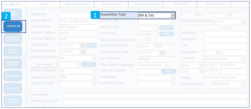 ? Watch Video Path: Front Office > Groups > Search 1. Verify the Guarantee type. 2. Select Check In from the Tools Menu. 3. Select YES on the notification stating that you will only be able to check in the Group Master and not the individual ...