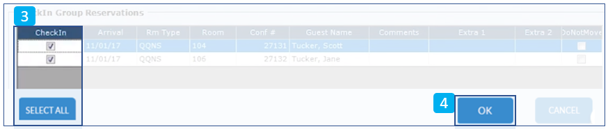 3. Using the Checkboxes or Select All button, select which rooms associated with the group you wish to check-in with the group account to expedite the check-in process. If you need to obtain any individual's guarantee of payment, this will have to be done one by one on each individual reservation.