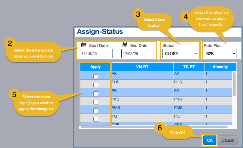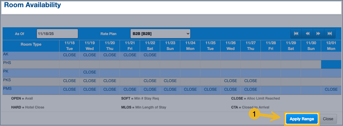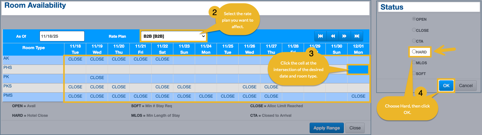 Use this method when you want to apply a hard close to several dates, several room types, or both at the same time—recommended for broader or longer-term availability restrictions.